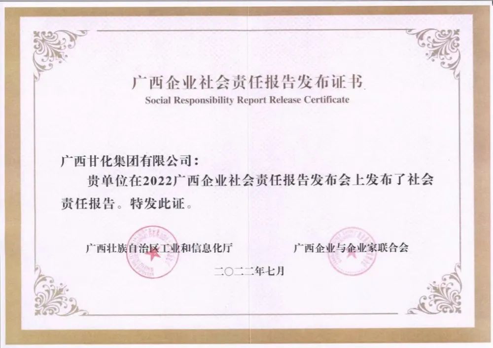 2022年7月13日,自治區(qū)工業(yè)與信息化廳和廣西企業(yè)與企業(yè)家聯(lián)合會在廣西南寧聯(lián)合舉辦“2022廣西企業(yè)社會責任報告發(fā)布會”,甘化集團在此次會議上獲頒廣西企業(yè)社會責任報告發(fā)布證書。