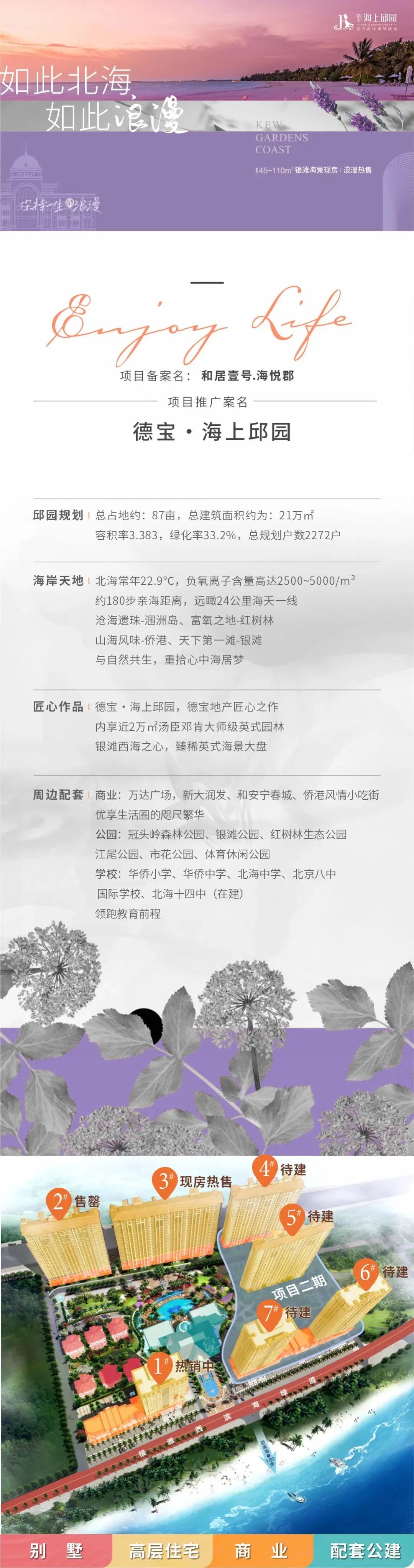 德寶?海上邱園總占地約87畝,總建筑面積218614平方米,容積率3.383,綠化率高達33%,項目分為兩期開發(fā),一期是由C1-C2-C3三棟高層和六棟花園洋房所組成,二期是由C4-C5-C6-C7四棟高層所組成。小區(qū)內(nèi)建設(shè)有中心景觀、廣場水系景觀、花園廣場、英式草坪、院落景觀、運動景觀以及商業(yè)景觀,讓您回家也像在公園一般。德寶?海上邱園是北海德寶地產(chǎn)有限公司投資開發(fā)的,打造的是一個英式海岸大景美宅。英式皇家園林、地下立體停車位、下沉式游泳池、等稀缺資源,將呈現(xiàn)旅居、康氧、度假型、生態(tài)型、經(jīng)營性型的天堂級生活體驗。