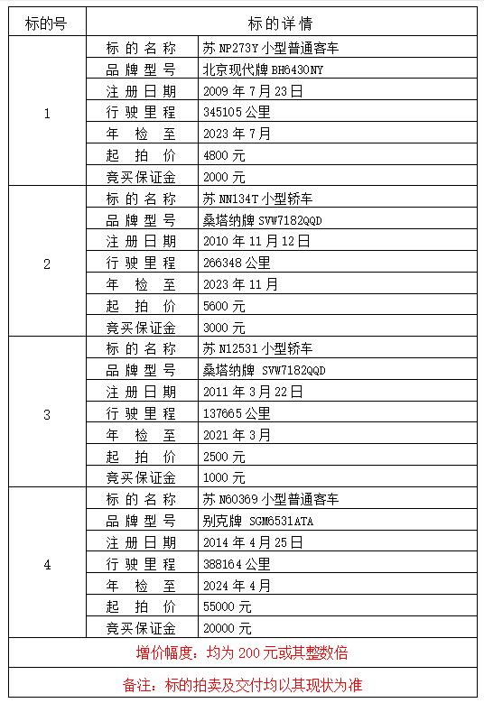 1.本次拍賣標的不含原車牌照。標的拍賣及交付時均以標的實物現(xiàn)狀為準,競買人應(yīng)在標的物展示時間內(nèi)主動向委托方咨詢標的相關(guān)情況,現(xiàn)場踏勘、了解標的現(xiàn)狀,未進行標的勘察的競買人后果自負。