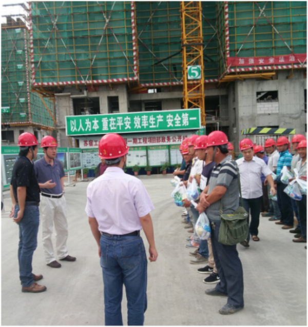 周原現(xiàn)場向施工人員發(fā)放了慰問品,并要求施工單位認(rèn)真做好防暑降溫工作,合理安排作息時間,確?,F(xiàn)場安全文明施工。