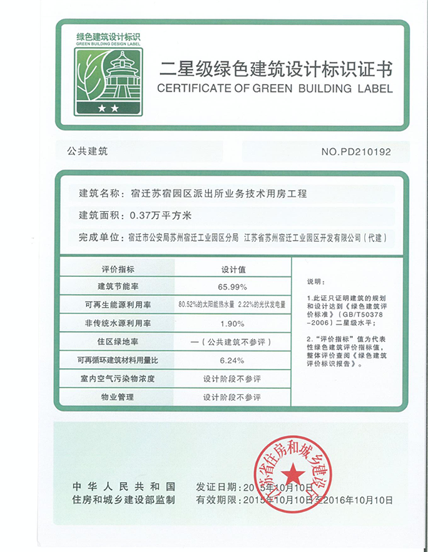 近日,由開發(fā)公司代建的蘇宿園區(qū)派出所業(yè)務(wù)技術(shù)用房工程,順利通過國家二星級綠色建筑設(shè)計(jì)標(biāo)識認(rèn)證。