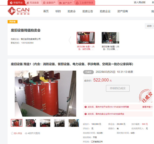 3月25日上午10時(shí),城發(fā)公司一批廢舊消防設(shè)備、餐廚設(shè)備、電力設(shè)備、手扶電梯、空調(diào)等物資在中拍平臺(tái)公開(kāi)拍賣,經(jīng)過(guò)30分鐘的緊張激烈競(jìng)價(jià),最終以522000元成交標(biāo)的,比評(píng)估價(jià)180000元高出342000元,溢價(jià)率190%。