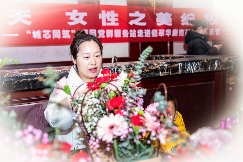 活動現(xiàn)場氣氛熱烈而融洽,居民們邊向老師學(xué)習(xí)邊交流,互相分享自己的插花心得。一朵朵美麗的花朵在大家的手中綻放,仿佛也在訴說著女性的堅韌與美麗。