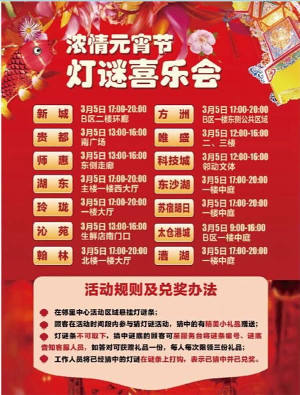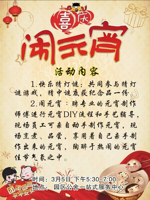 元宵節(jié)期間,園區(qū)公舍、蘇宿明日鄰里中心均為廣大園區(qū)居民奉上了精彩活動(dòng),有獎(jiǎng)品多多的“快樂猜燈謎”,還有專業(yè)的元宵DIY現(xiàn)場(chǎng)輔導(dǎo),歡迎園區(qū)居民和工友們前來(lái)參加。