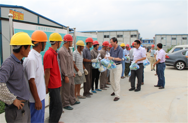 8月11日上午,園區(qū)黨工委委員、規(guī)劃建設(shè)局局長周原帶隊(duì)來到夢家園、許莊變、2014年市政二標(biāo)等項(xiàng)目工地,檢查防暑降溫措施落實(shí)情況,并慰問奮戰(zhàn)在高溫一線的建筑工人。