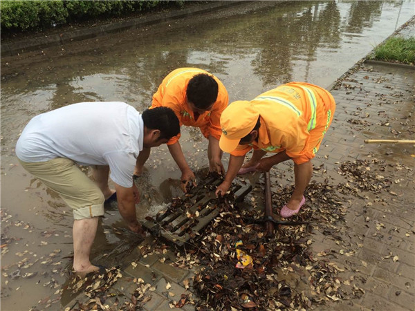 市政搶險(xiǎn)疏通小組迅速調(diào)集人員及物資力量,開展區(qū)內(nèi)泄洪及排水工作。公舍等項(xiàng)目為迅速排澇,員工在水中冒雨架好水泵,安裝吸水管,鋪設(shè)排水水帶,發(fā)動機(jī)器快速排水,使公舍車庫等水位快速下降。