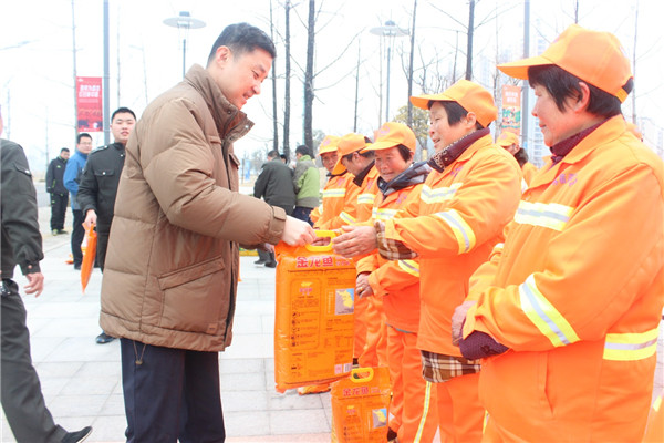 1月18日上午,園區(qū)黨工委委員、管委會(huì)副主任、規(guī)劃建設(shè)局局長(zhǎng)許紹杰帶隊(duì)慰問(wèn)了奮戰(zhàn)在一線(xiàn)的城市維護(hù)作業(yè)人員,向他們送上了春節(jié)的問(wèn)候。